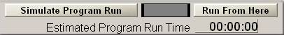 The Simulate Program Run button allows the user to quickly execute the program without any machine movement to get an estimated program run time. This time is then displayed. It is worth noting that this doesn’t give a very precise time estimate in many cases since it doesn’t account for axis acceleration and deceleration which may add up to a significant amount of time if you have a program with many short movement segments.The Run From Here button allows the user to highlight a line of code in the program from which to start the program when the Cycle Start button is pushed. The user simply scrolls down through the program until the desired line is highlighted in white. When the desired starting line is highlighted press the Run From Here button and the program lines will be quickly scrolled through until that line of code is reached. The user then simply presses Cycle Start to execute the program from that line.